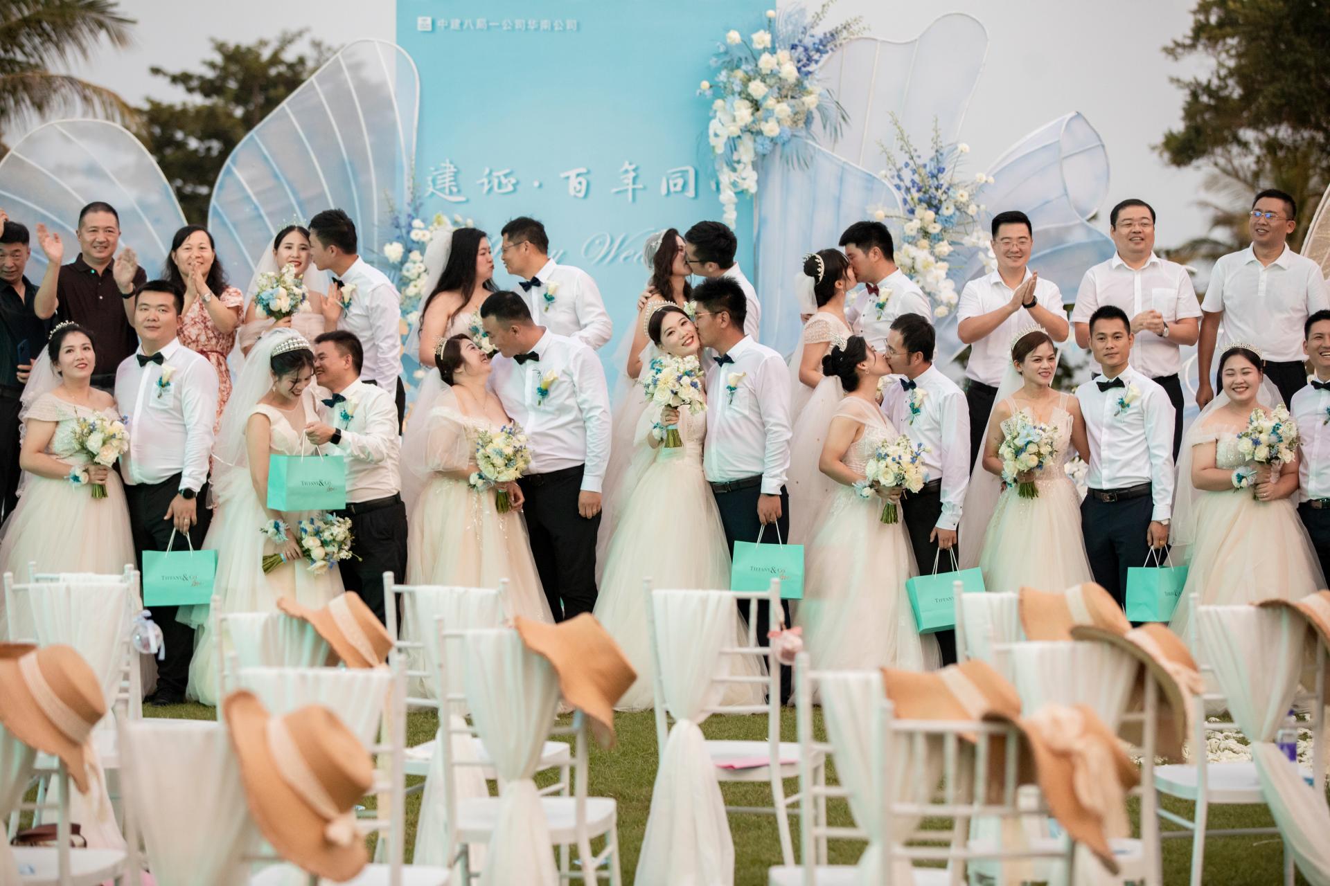 椰林環(huán)繞,碧海聽濤,10月10日,在充滿浪漫氣息的三亞天涯海角,中建八一舉辦“建證·百年同心”集體婚禮活動。 13對新人在親友、同事的見證下許下愛情盟誓,走進婚姻殿堂。
