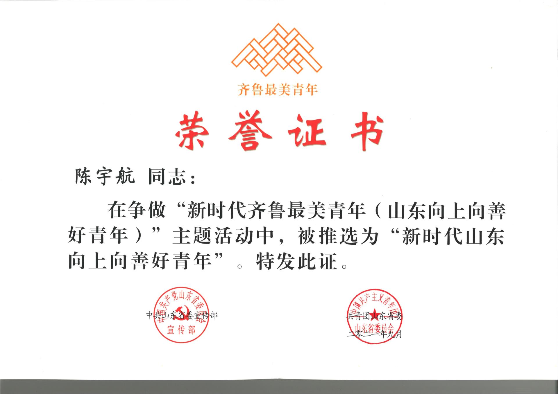 陳宇航榮獲“新時代山東向上向善好青年”!