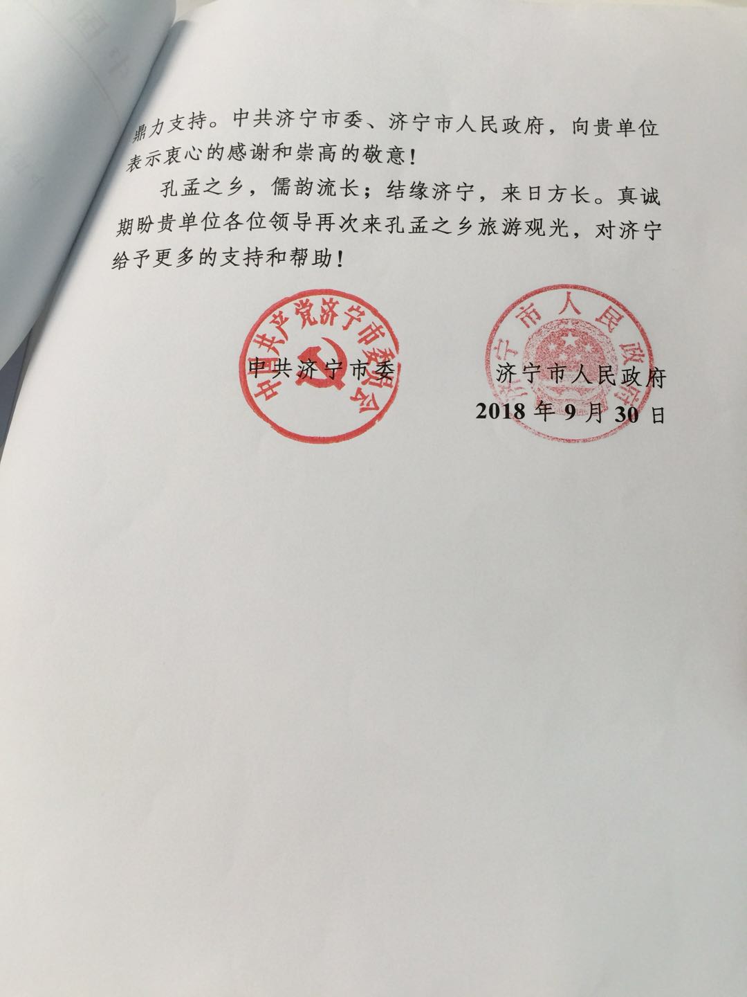 感謝信中表示“萬(wàn)眾一心,共襄盛舉。本次文化節(jié)和論壇規(guī)模大、規(guī)格高、影響廣,籌備時(shí)間緊、任務(wù)重,取得圓滿成功得益于各方的同心協(xié)力、精誠(chéng)合作,更離不開(kāi)貴單位的鼎力支持。中共濟(jì)寧市、濟(jì)寧市政府,向貴單位表示衷心的感謝和崇高的敬意!”
