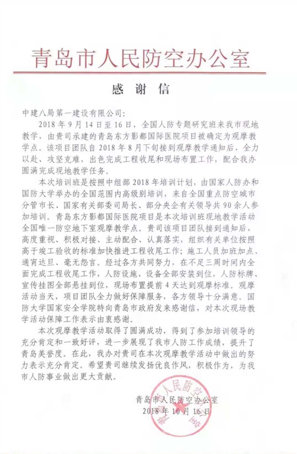 近日,青島萬達東方影都國際學校、醫(yī)院項目部收到了青島市人民防空辦公室發(fā)來的表揚信。信中著重肯定了我司在全國人防專題研究班現(xiàn)地教學活動中的突出貢獻,贊揚我公司能夠積極配合青島市人防辦開展工作,顯示出較強的大局意識、政治意識和較高的工作水平,同時肯定了公司的優(yōu)良作風并對后序工程項目工作的寄于厚望。