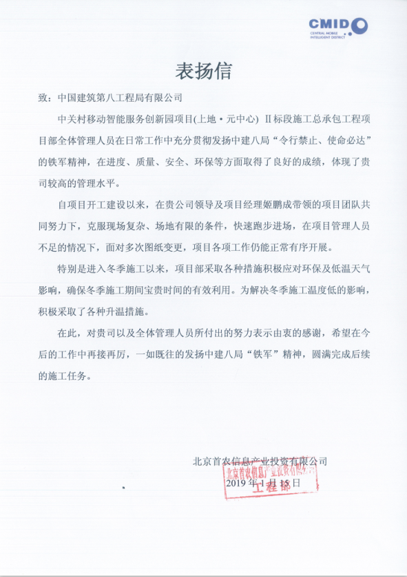 近日,上地·元中心項(xiàng)目收到來(lái)自北京首農(nóng)信息產(chǎn)業(yè)投資有限公司的表?yè)P(yáng)信。