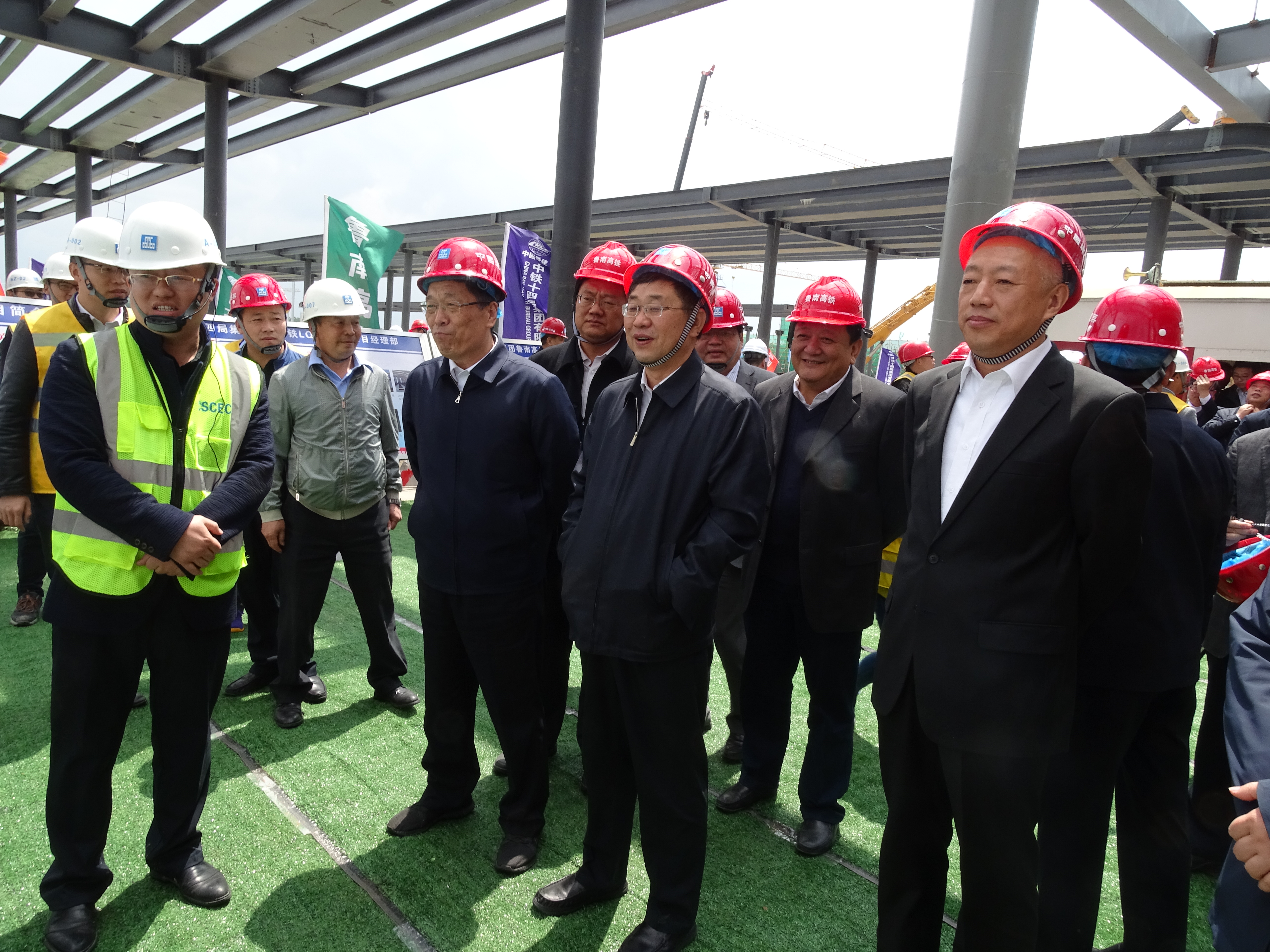 4月28日,中國鐵路總公司副總經(jīng)理王同軍,工管中心主任李志義,山東省政府黨組成員凌文,省交通運輸廳廳長江成,臨沂市委書記王玉君,臨沂市長孟慶斌,濟(jì)南鐵路局總經(jīng)理王新春,山東鐵投集團(tuán)董事長姜長興,魯南高鐵公司董事長王基全等一行多人,添乘軌道車到魯南高鐵站房項目調(diào)研,中建山東投資有限公司董事長裴正強、中建八局一公司青島公司副總經(jīng)理邸國輝等陪同。