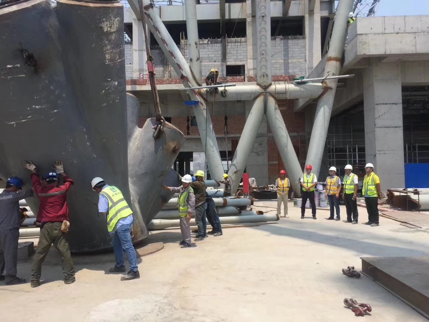從7月2日11時58分開始起吊,在一座移動式塔吊和一輛260噸汽車吊的共同努力下,重達(dá)76噸的鑄鋼件緩緩地從地下室吊裝到南站房站臺層。從遠(yuǎn)處觀看它們就是一對轉(zhuǎn)接支座,支撐南站房的大型懸挑屋蓋結(jié)構(gòu),連接人字形支座和外挑的鋼梁。“臺上一分鐘,臺下十年功”。短短半小時的吊裝,確是讓我們管理人員付出了很多努力,鋼結(jié)構(gòu)深化設(shè)計、人員駐場、各方協(xié)調(diào)以及將初期難度分散到加工廠,而降低現(xiàn)場的安裝難度,真正做到了設(shè)計引領(lǐng)施工。