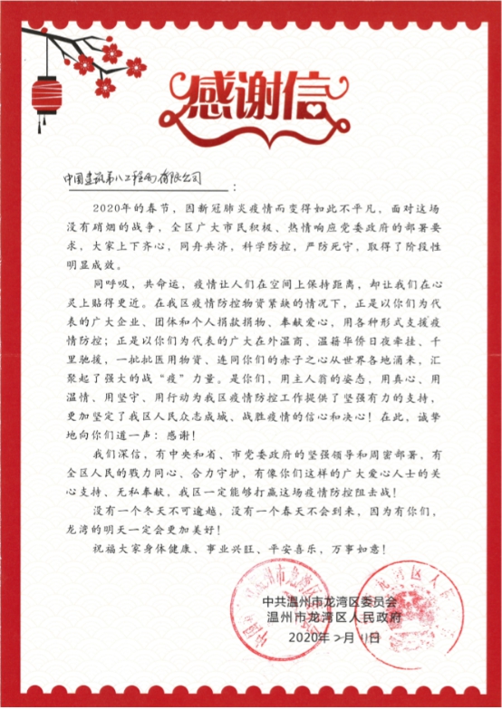 3月2日,中共溫州市龍灣區(qū)委、溫州市龍灣區(qū)人民政府向溫州高新文化廣場項(xiàng)目發(fā)來感謝信,對項(xiàng)目在春節(jié)期間在新冠病毒疫情防控上所做出的貢獻(xiàn)表示感謝。