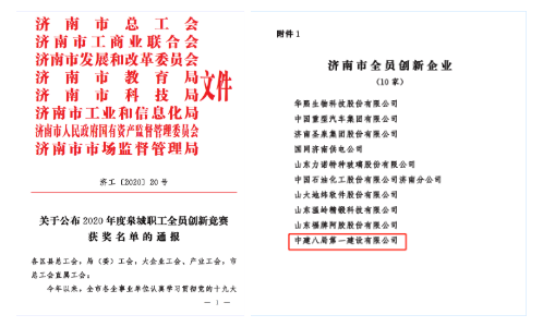 近日,山東省總工會(huì)、濟(jì)南市總工會(huì)相繼發(fā)布《關(guān)于公布 2020 年山東省全員創(chuàng)新企業(yè)的通知》和《關(guān)于2020年度泉城職工全員創(chuàng)新競(jìng)賽獲獎(jiǎng)名單的通報(bào)》,公司共榮獲5項(xiàng)獎(jiǎng)項(xiàng)。分別是“山東省全員創(chuàng)新企業(yè)”、“濟(jì)南市全員創(chuàng)新企業(yè)”、“濟(jì)南市創(chuàng)新型班組(綠色產(chǎn)業(yè)園新型模架工廠班組)”、“濟(jì)南市創(chuàng)新能手(張軍)”、“濟(jì)南市職工優(yōu)秀技術(shù)成果”。
