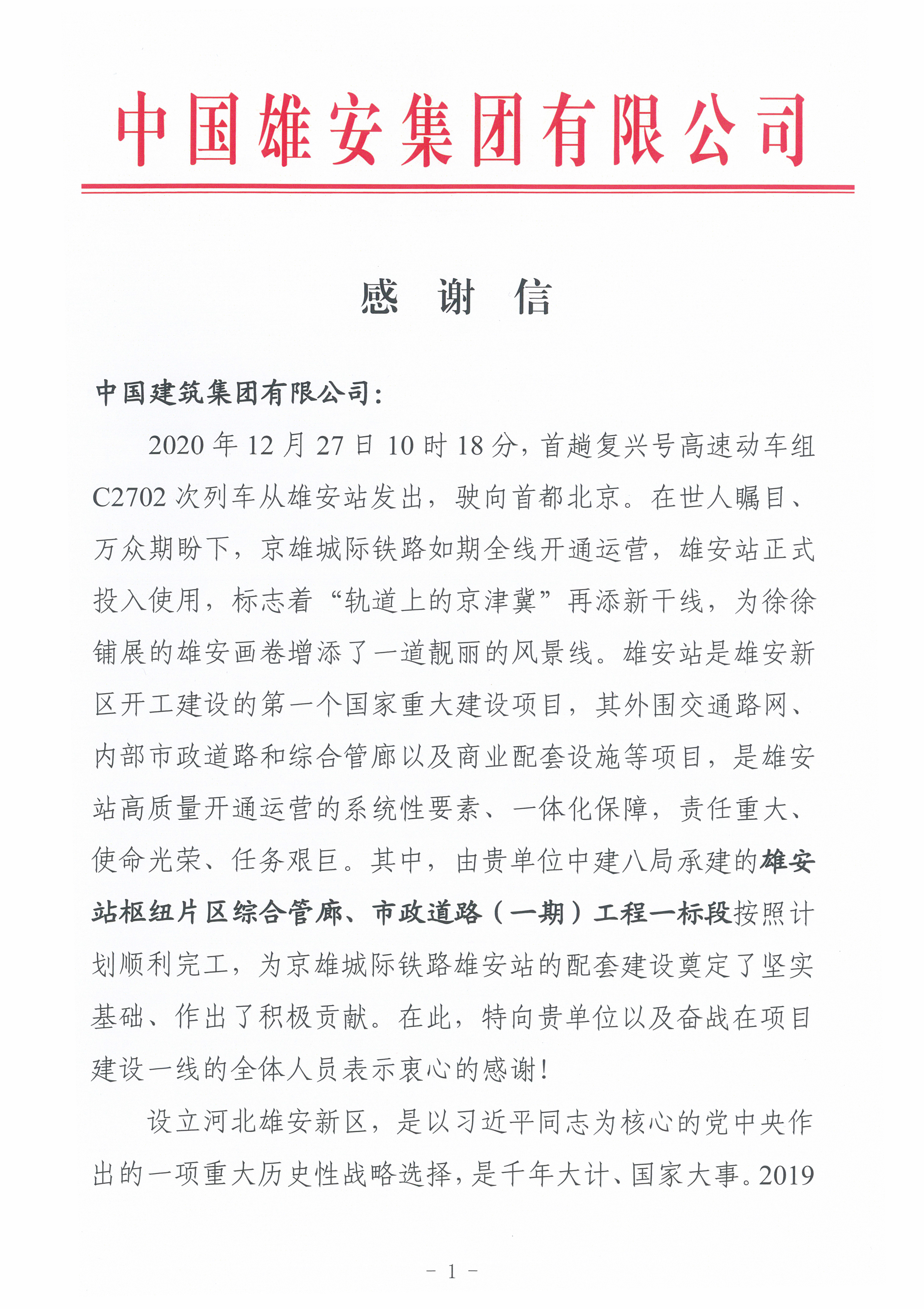 近日,中建八一承建的雄安站樞紐片區(qū)市政道路、綜合管廊、排水管網(wǎng)系統(tǒng)(一期)工程一標(biāo)段項(xiàng)目,收到中國(guó)雄安集團(tuán)發(fā)來(lái)的兩封感謝信。信中對(duì)中建集團(tuán)、中建八局攻堅(jiān)克難、完美履約,圓滿完成京雄城際鐵路“保開通段”任務(wù),表示衷心感謝。