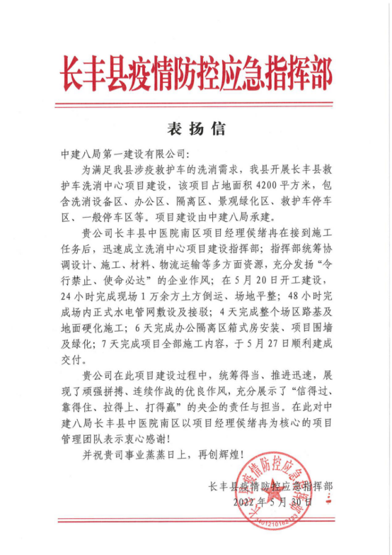 中建八一獲長豐縣疫情防控應(yīng)急指揮部表揚(yáng)信