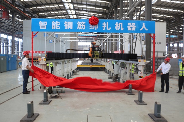 隨后,來到第六跨疊合板自動化流水生產(chǎn)線,寧文忠、李鐵軍共同為智能鋼筋綁扎機器人揭彩。該機器人是一種可視覺導(dǎo)引的六軸鋼筋綁扎機器人,安放在流水線的鋼筋綁扎區(qū)域,能夠高效精準(zhǔn)的進行鋼筋綁扎工作,具有自動識別,精準(zhǔn)高效、協(xié)同作業(yè)、一機雙控等特點,綁扎速度是人工的2倍,大大提高鋼筋綁扎效率。
