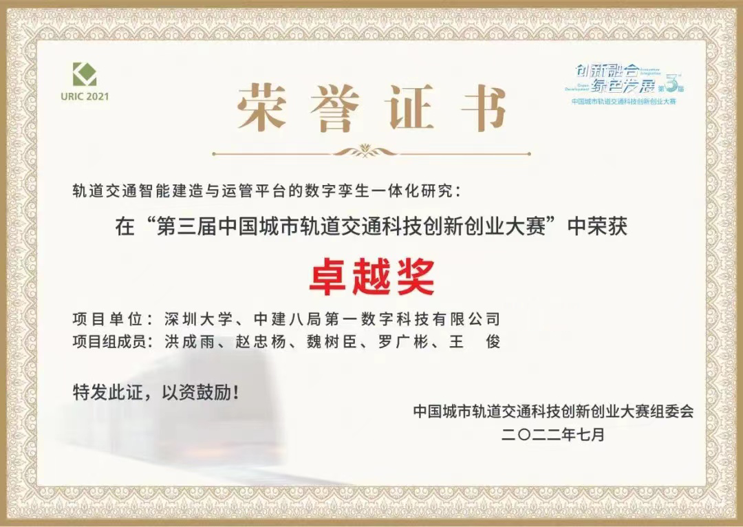 近日,第三屆中國城市軌道交通科技創(chuàng)新創(chuàng)業(yè)大賽全國總決賽暨頒獎盛典在北京圓滿舉行,中建八局一公司數(shù)字科技公司與深圳大學聯(lián)合創(chuàng)新的“軌道交通智能建造與運管平臺的數(shù)字孿生一體化研究”項目,榮獲總決賽基礎研究組最高獎“卓越獎”。