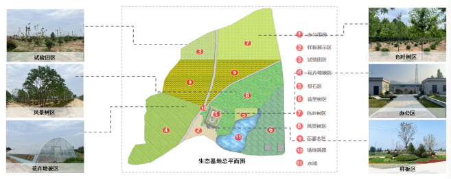 基地位于濟南市萊蕪區(qū),占地面積150余畝,包括樣板展示區(qū)、試驗田區(qū)、花卉地被區(qū)、景石區(qū)、造型樹區(qū)、色葉樹區(qū)、風景樹區(qū)、花灌木區(qū)、水域等共11個區(qū)域,涵蓋苗木種植、現(xiàn)代農(nóng)業(yè)研發(fā)等功能,主要有烏桕、櫸樹、樸樹、娜塔櫟、造型松、玉蘭等苗木品種。