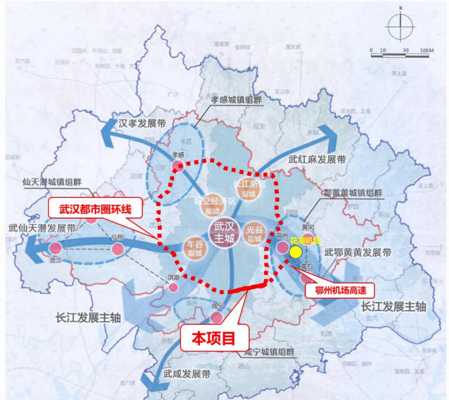 ▲武漢都市區(qū)環(huán)線江夏至梁子湖段(南段)工程,全長(zhǎng)36km,建成后將形成武漢大都市區(qū)“1小時(shí)通勤圈”。