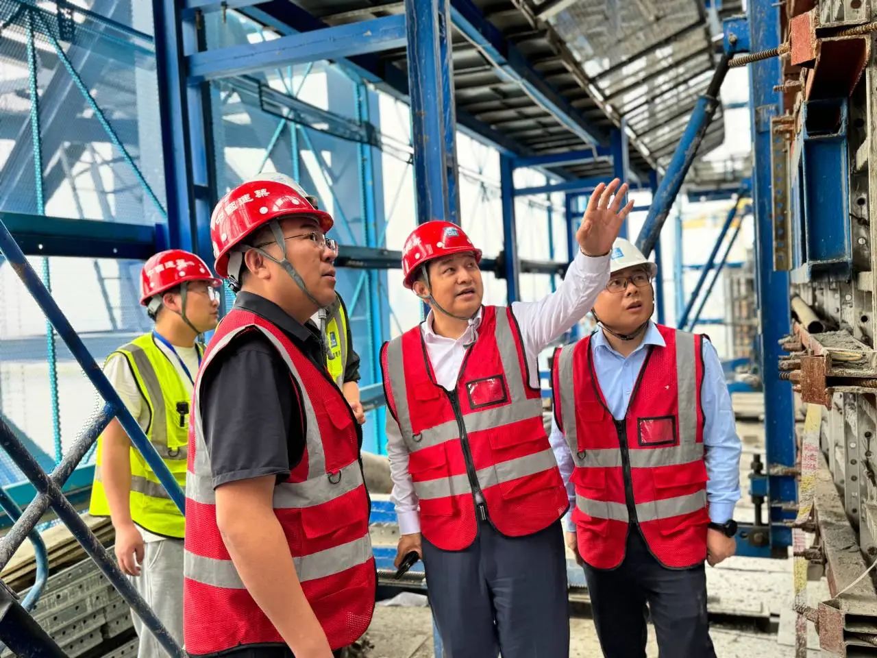 在上海重點(diǎn)項(xiàng)目,牛化憲深入施工一線,詳細(xì)了解項(xiàng)目履約進(jìn)度、精益管理情況,實(shí)地檢查了現(xiàn)場大型機(jī)械、臨時(shí)用電、爬模及鋁模支撐架搭設(shè)等管理落實(shí)情況,并提出五點(diǎn)要求:一是強(qiáng)化履約擔(dān)當(dāng),動(dòng)態(tài)統(tǒng)籌大型機(jī)械布設(shè),加快基坑及主體區(qū)域施工進(jìn)度,確保項(xiàng)目如期交付;二是筑牢安全防線,嚴(yán)格規(guī)范汽車吊作業(yè)警戒區(qū)域管理,加大電箱接線、現(xiàn)場消防配置、切割機(jī)防護(hù)等環(huán)節(jié)的管控力度,提高巡檢二維碼應(yīng)用實(shí)效,保障項(xiàng)目平穩(wěn)推進(jìn);三是重視爬模作業(yè)管控,杜絕作業(yè)面材料過量堆載,保證爬模限位銷正確安裝;四是提高質(zhì)量標(biāo)準(zhǔn),堅(jiān)持以方案指導(dǎo)施工,推進(jìn)地下室滲漏專項(xiàng)治理,加強(qiáng)鋁模支撐架體管控,打造精品工程;五是深化精益管控,細(xì)化項(xiàng)目管理流程,優(yōu)化資源配置,全面提升經(jīng)營質(zhì)效。