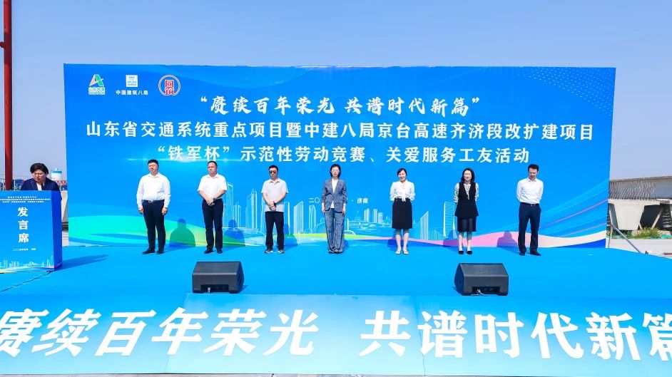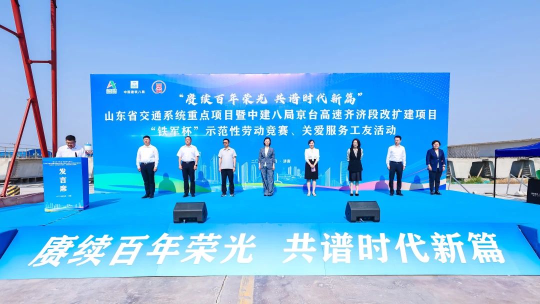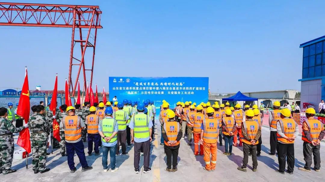開啟夏日攻堅,建功交通強國。5月27日,山東省交通系統(tǒng)重點項目暨中建八局“鐵軍杯”示范性勞動競賽、關(guān)愛服務工友活動在中建八局承建的京臺高速齊濟段改擴建項目正式啟動,吹響履約奮進“沖鋒號”。