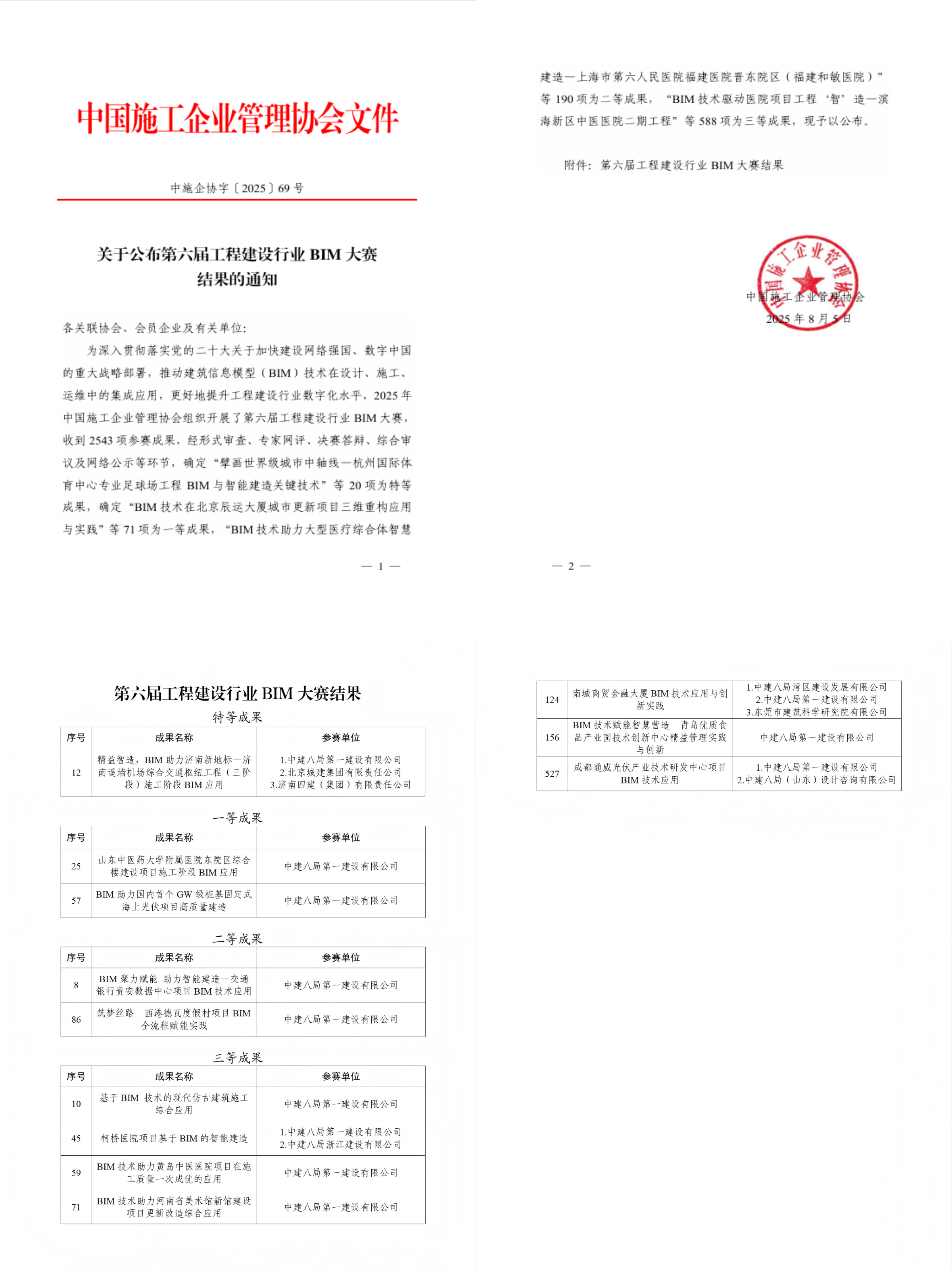近日,中國(guó)施工企業(yè)管理協(xié)會(huì)正式公布第六屆工程建設(shè)行業(yè)BIM大賽成果,中建八一榮獲特等成果1項(xiàng)、一等成果2項(xiàng)、二等成果2項(xiàng)、三等成果7項(xiàng),獲獎(jiǎng)項(xiàng)目涵蓋機(jī)場(chǎng)建設(shè)、醫(yī)療衛(wèi)生、海上光伏、仿古建筑、工業(yè)園區(qū)等多個(gè)領(lǐng)域,充分展現(xiàn)公司智能建造與數(shù)字轉(zhuǎn)型領(lǐng)域特色優(yōu)勢(shì)。