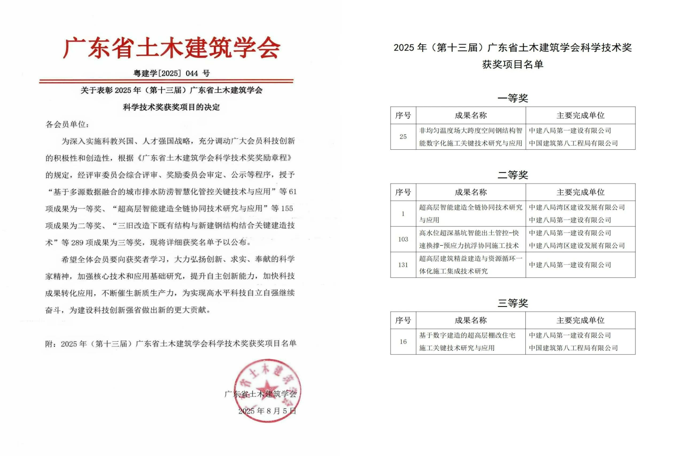 近日,第十三屆廣東省土木建筑學會科學技術(shù)獎獲獎項目公布,中建八局一公司榮獲一等獎 1 項、二等獎 3 項、三等獎 1 項,成果涵蓋會議會展、商業(yè)綜合體、超高層建筑、棚改住宅等領(lǐng)域,以科技創(chuàng)新賦能“好產(chǎn)品”。