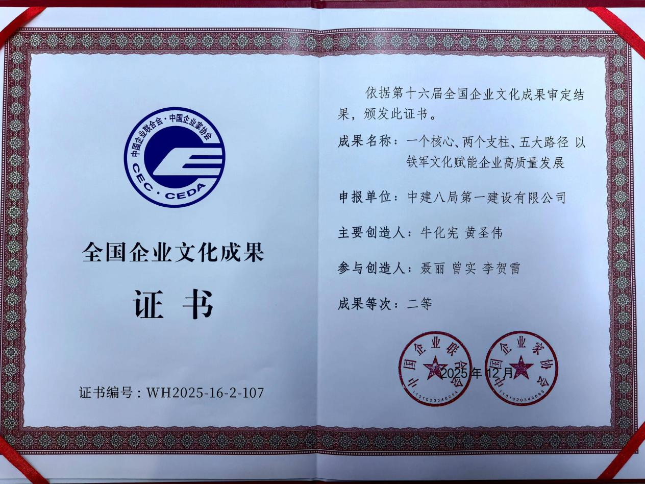 12月2日,由中國(guó)企業(yè)聯(lián)合會(huì)、中國(guó)企業(yè)家協(xié)會(huì)主辦的第十六屆全國(guó)企業(yè)文化年會(huì)在青島盛大召開(kāi)。會(huì)上隆重發(fā)布全國(guó)企業(yè)文化成果,中建八局一公司憑借“一個(gè)核心、兩個(gè)支柱、五大路徑 以鐵軍文化賦能企業(yè)高質(zhì)量發(fā)展”成果,榮膺“全國(guó)企業(yè)文化成果二等獎(jiǎng)”,充分體現(xiàn)了公司在黨建引領(lǐng)與企業(yè)文化深度融合方面的卓越實(shí)踐。