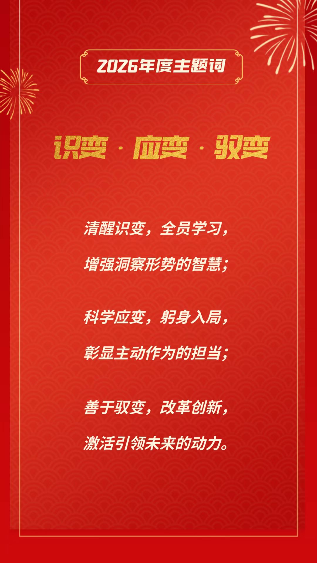 1月1日,公司發(fā)布2026年度主題詞——識(shí)變?應(yīng)變?馭變。清醒識(shí)變,全員學(xué)習(xí),增強(qiáng)洞察形勢(shì)的智慧;科學(xué)應(yīng)變,躬身入局,彰顯主動(dòng)作為的擔(dān)當(dāng);善于馭變,改革創(chuàng)新,激活引領(lǐng)未來(lái)的動(dòng)力。