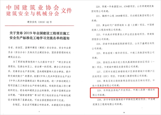 2019年年末之際,東郊飯店房地產(chǎn)開發(fā)項目喜訊頻傳,先后榮獲2019年度“全國建設(shè)工程項目施工安全生產(chǎn)標(biāo)準(zhǔn)化工地”、 “全國安全管理標(biāo)準(zhǔn)化示范班組” 兩項國家級安全管理榮譽。