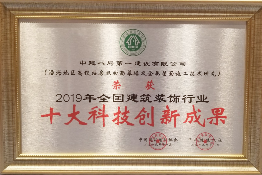 公司榮獲全國(guó)建筑裝飾行業(yè)十大科技創(chuàng)新成果