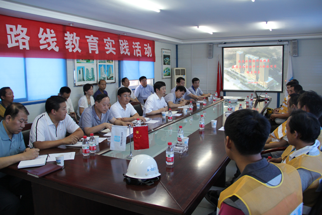 8月9號(hào)下午,濟(jì)南市紀(jì)委書記慕建民、市建委書記張洪躍一行來到奧體金融中心A棟樓項(xiàng)目開展黨的群眾路線教育實(shí)踐活動(dòng),魯班公司副總經(jīng)理阮云豐、總工程師史振春、局總經(jīng)理助理、山東分局黨委書記王克復(fù)、公司黨委書記許紅、紀(jì)委書記薛樹海、中建一局山東公司總經(jīng)理張炳成及農(nóng)民工兄弟代表參加。