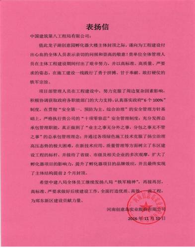 封頂儀式由河南分公司經(jīng)理何偉主持,各單位代表參加,河南省省委宣傳部副部長、河南日報報業(yè)集團黨委書記、董事長、社長趙鐵軍宣布:龍子湖創(chuàng)意園孵化器大樓工程,金頂落成!公司副總經(jīng)理寧文忠代表我方感謝各單位的支持,并做出莊嚴承諾,爭取早日交給業(yè)主一個滿意、優(yōu)質、放心的好房子。業(yè)主單位負責人程勇當場宣讀表揚信:感謝八局全力以赴抓質量,保安全,促生產(chǎn),勇于拼搏,甘于奉獻,真正做到了“業(yè)主之事無分外之事,分包之事無不管之事”的總承包管理理念。希望我們繼續(xù)發(fā)揚八局“鐵軍精神”,再接再厲,高標準、嚴要求做好后續(xù)建設工作,全面打造優(yōu)質、高效、一流工程,為鄭東新區(qū)建設貢獻力量。此次工程的提前封頂也激發(fā)了項目全體人員敢打必贏的工作豪情,增強了大家圓滿完成孵化器項目,努力向公司交一份滿意答卷的信心。