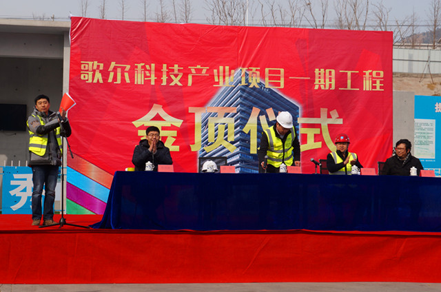 1月30日,青島公司歌爾科技產(chǎn)業(yè)項目一期工程舉行隆重的主體封頂儀式。儀式由歌爾科技有限公司項目副總濮陽主持,公司相關(guān)人員參加了封頂儀式。上午11時18分,隨著最后一斗混凝土的澆筑完成,歌爾集團副總裁姜傳朋代表業(yè)主宣布:歌爾科技產(chǎn)業(yè)項目一期工程順利封頂。