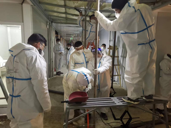 3月的吉林氣溫低至0℃,中建八一1300余名建設(shè)者“零點”作戰(zhàn),跟疫情搶時間,12小時內(nèi)完成A5區(qū)全部機械布置,24小時內(nèi)完成A5區(qū)全部底板拼裝,48小時內(nèi)完成654間板房主體拼裝,72小時內(nèi)完成654間板房墻板及門窗安裝。