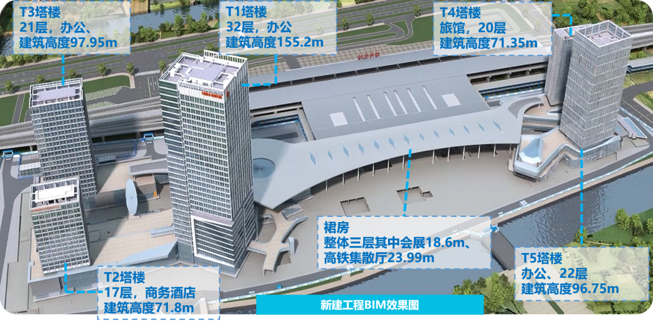 該項(xiàng)目是浙江省重點(diǎn)工程、紹興市一號工程,位于紹興北站周邊區(qū)域,北鄰高鐵站房、南靠嘉會河,總建筑面積約55萬平方米,其中地下三層(局部四層)、地下建筑面積達(dá)22萬平方米,地下大空間結(jié)構(gòu)復(fù)雜,是集商務(wù)辦公、科創(chuàng)研發(fā)、星級酒店、商業(yè)零售等多重功能于一體的智慧型城市交通綜合體。