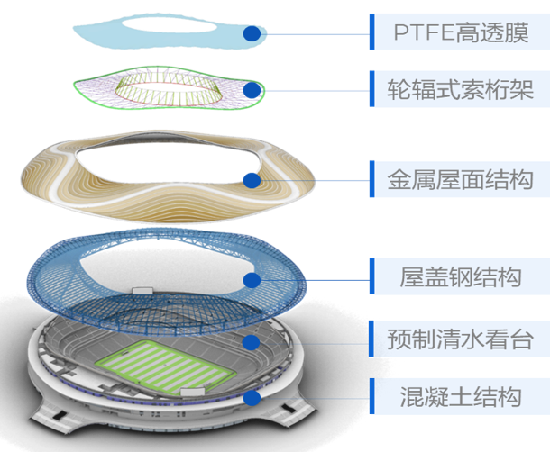 體育場(chǎng)屋蓋結(jié)構(gòu)由鋼結(jié)構(gòu)索膜結(jié)構(gòu)和金屬屋面組成,形成了平面投影為中央開(kāi)孔的高60米、直徑約280米的圓形,屋頂沿環(huán)向呈波浪起伏狀,是世界首個(gè)平面單層膜輪輻式索膜結(jié)構(gòu)體系,也是國(guó)內(nèi)首例專(zhuān)業(yè)足球場(chǎng)大規(guī)模應(yīng)用高透光率PTFE網(wǎng)格膜材料。