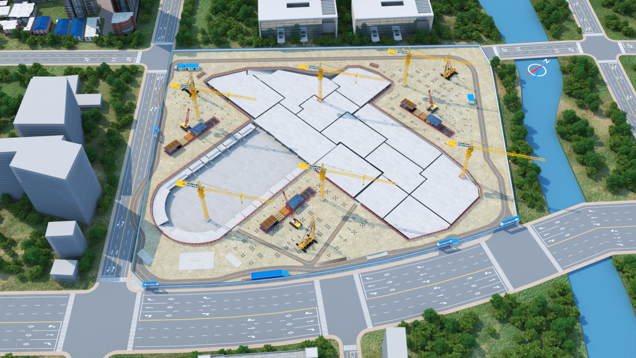 項目為半地下室切割施工,現(xiàn)場施工區(qū)域分段較多,同時首層多為架空層,各單體銜接測量精度要求高,項目借助學(xué)校整體BIM模型,提前規(guī)劃項目施工平面布置,合理布置材料堆場與施工道路,結(jié)合現(xiàn)場實際進度,適時調(diào)整場地平面布置轉(zhuǎn)換。