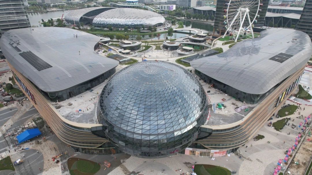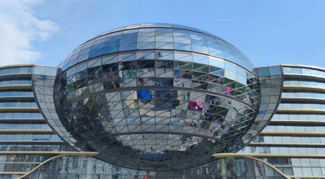橢球造型長軸68m,短軸54m,采用超大規(guī)格的玻璃板材進行裝飾,為打造最優(yōu)裝飾效果,項目采用三維掃描技術精確建模,將橢球體細分為3528塊不規(guī)則三角形平板,確保每一塊玻璃都能完美貼合。