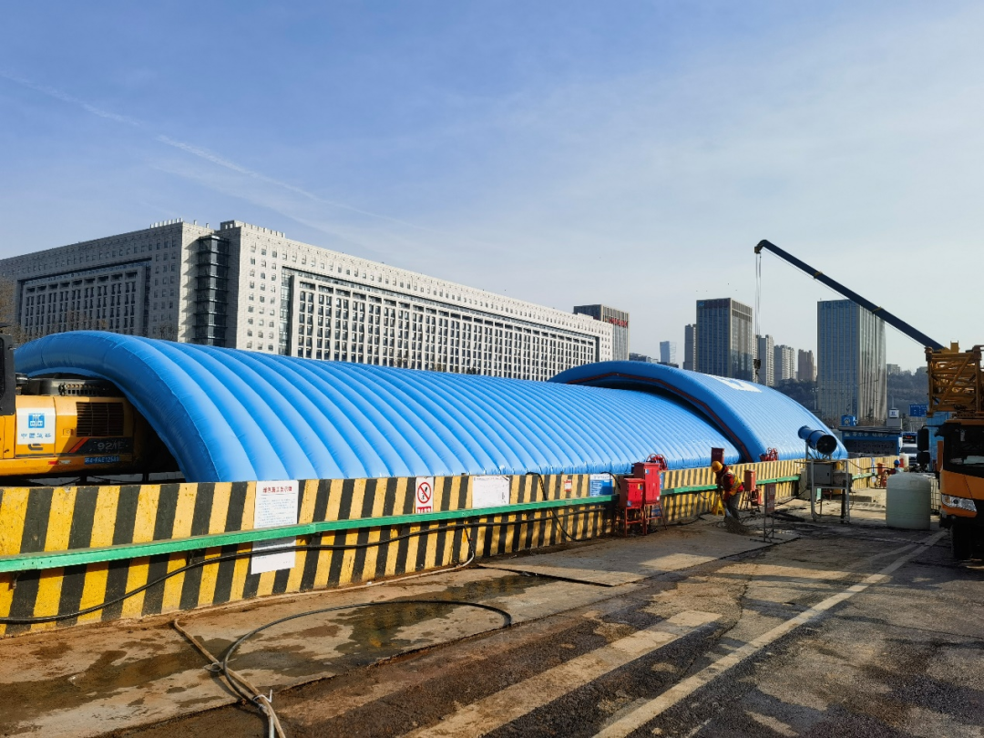濟(jì)南軌道交通7號(hào)線的滑移型氣肋式基坑氣膜屬全國首例,也是基坑氣膜在地鐵項(xiàng)目的首次應(yīng)用。通過安裝高強(qiáng)度、高耐久性、防火性能好的充氣膜材料,向膜內(nèi)充氣,在工地上方形成一個(gè)密閉的空間,具有良好的隔音和防塵性能,同時(shí)還能保溫、防雨雪,改善冬季施工環(huán)境,給建設(shè)者們提供更好的施工條件。