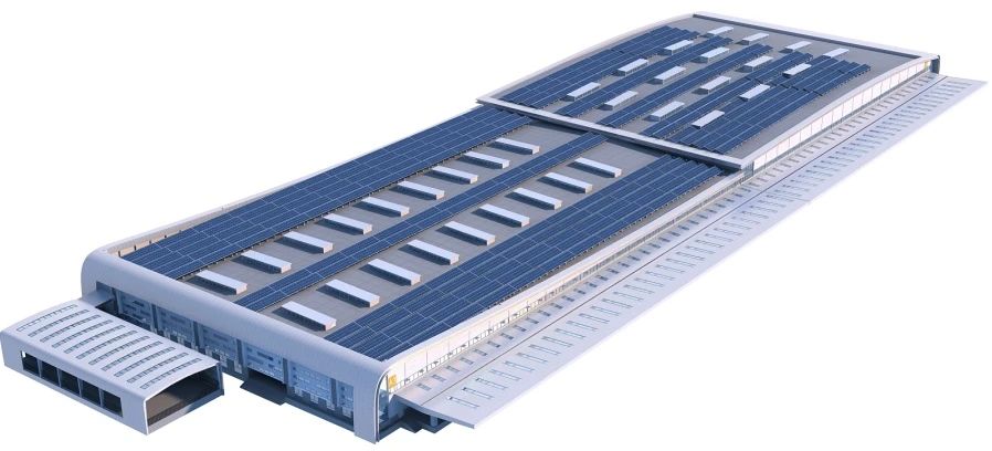 項目建設(shè)4棟單體廠房,最大單層面積1.9萬平方米,共設(shè)有21個5噸月臺升降機,滿足教輔教材等貨物儲存、分揀需求,廠房屋面安裝大面積光伏系統(tǒng)可實現(xiàn)部分園區(qū)設(shè)施、周邊交通運輸及公共設(shè)施“零碳”供電。