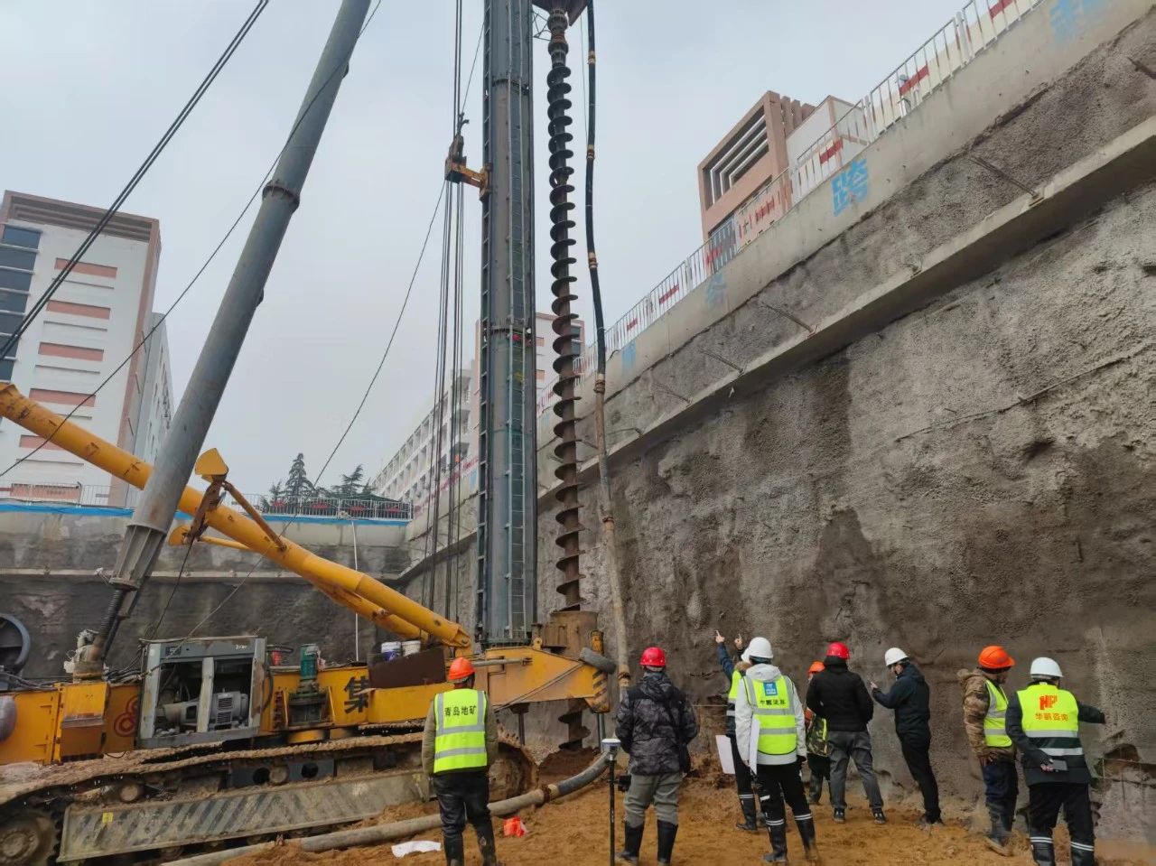 項(xiàng)目地下水情況復(fù)雜,工程樁成樁困難,項(xiàng)目組織專家論證及現(xiàn)場水頭壓力試驗(yàn),創(chuàng)新性應(yīng)用嵌巖型長螺旋鉆孔灌注工藝,改良機(jī)械與降排水方式,優(yōu)化混凝土配合比,有效降低承壓水對施工的影響。