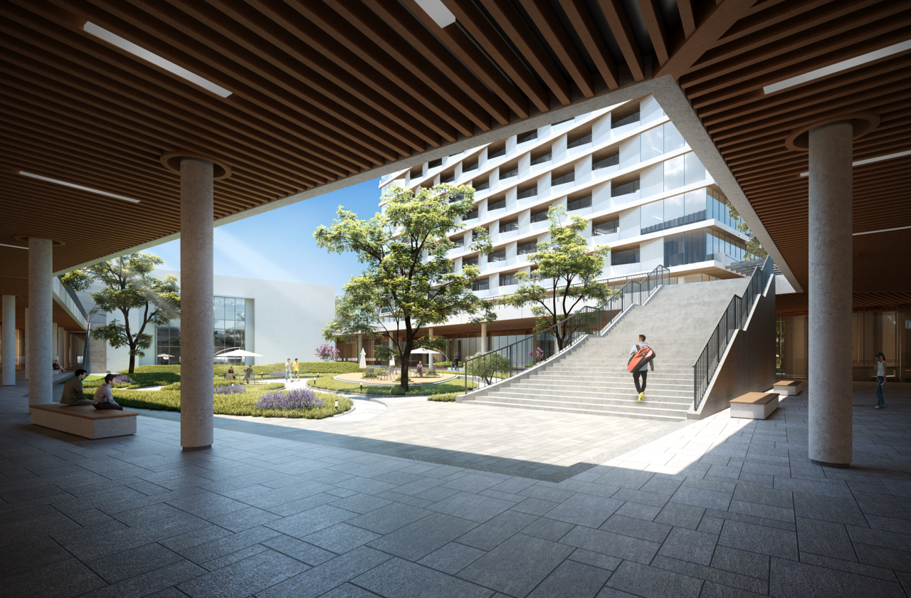 項目在“大平臺”中部打造下沉庭院,將首層訓練館降低到與負一層平齊,使內(nèi)部場地和城市道路天然隔開,為運動員創(chuàng)造安靜私密的內(nèi)向性空間,且降低了龐大體量對臨近道路造成的壓迫感。