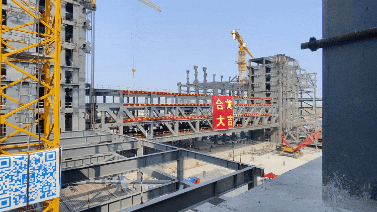 項目由6根立柱式核心筒及大量框架托舉起頂部的“鋼鐵頂冠”,呈現(xiàn)出“平行世界”的設(shè)計理念,其中大噸位、大跨度整體提升鋼連廊最大懸挑44米,整體提升高度30米,是濟南市起步區(qū)首個跨度超90米的高空鋼桁架結(jié)構(gòu)。