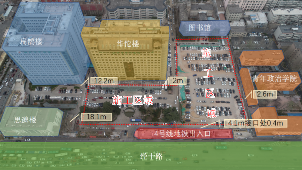作為國家 “十四五” 重點(diǎn)建設(shè)項(xiàng)目、山東省重點(diǎn)民生工程及國家中醫(yī)疫病防治基地,該項(xiàng)目是中建八局一公司與山東中醫(yī)藥大學(xué)附屬醫(yī)院的第四次攜手合作。項(xiàng)目總建筑面積達(dá) 11.26 萬平方米,涵蓋體檢中心、潔凈手術(shù)、ICU 等多個(gè)功能區(qū),規(guī)劃床位 810 張,建成后將為區(qū)域醫(yī)療健康保障注入強(qiáng)勁動(dòng)力。然而,項(xiàng)目建設(shè)面臨的挑戰(zhàn)堪稱 “極限”:南側(cè)距地鐵出入口僅 4 米,西側(cè)與醫(yī)院華佗樓間距不足 2 米,東側(cè)、北側(cè)被校園環(huán)繞,場地空間極度受限;同時(shí)地處濟(jì)南富水地層,對(duì)噪音控制、揚(yáng)塵治理及泉脈保護(hù)提出了極高要求。
