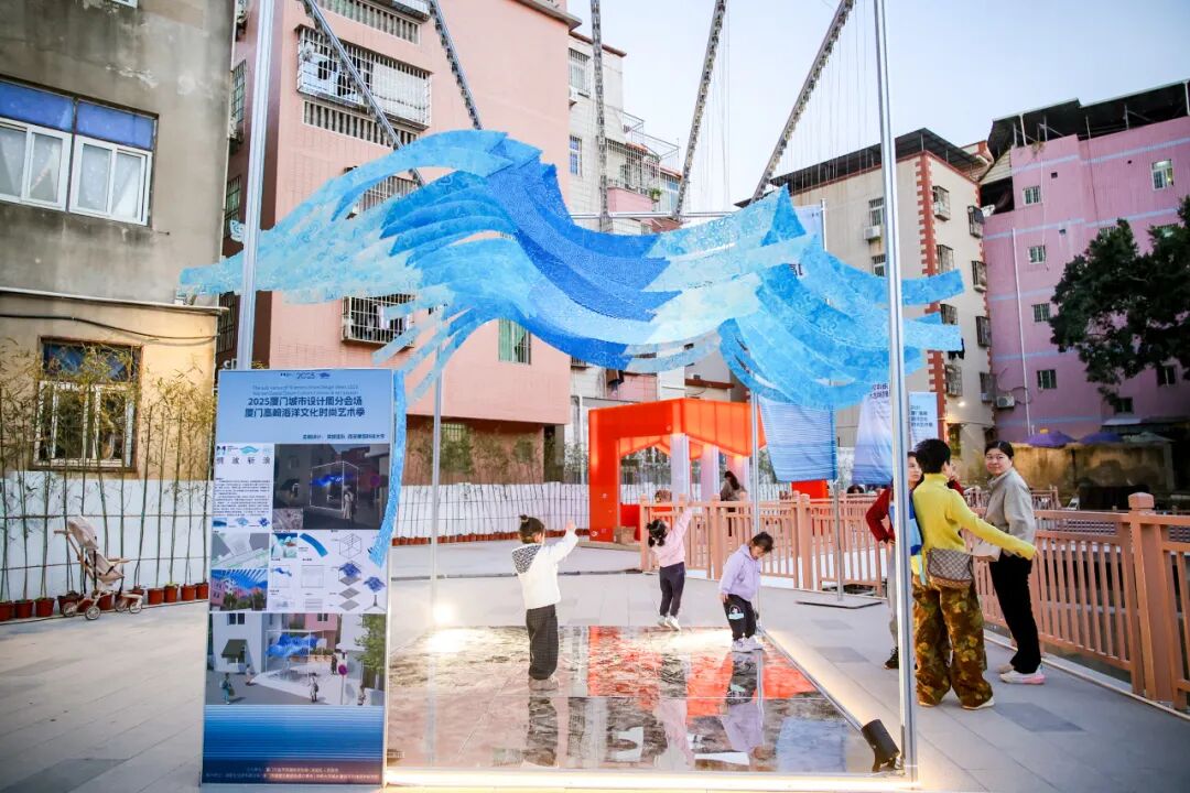 藝術(shù)季期間,古寨墻下的裝置復(fù)刻海潮律動,3D 打印浪影與竹編漁網(wǎng)交織古今,互動繩墻可編織祈福心愿,天橋上的輕構(gòu)藝術(shù)模擬浪濤起伏,涵洞剪影定格城市流動光影。項目聯(lián)合清華大學(xué)、同濟大學(xué)等多所高校的設(shè)計團隊,以海洋文化、地域記憶與城市共生為靈感,打造了 19 個散落于公共空間的藝術(shù)裝置。通過 “巧妙遮蔽外露電箱”“回收塑料瓶”“廢棄的船木再設(shè)計” 等方式,將藝術(shù)欣賞、空間探索與社區(qū)導(dǎo)覽融為一體。