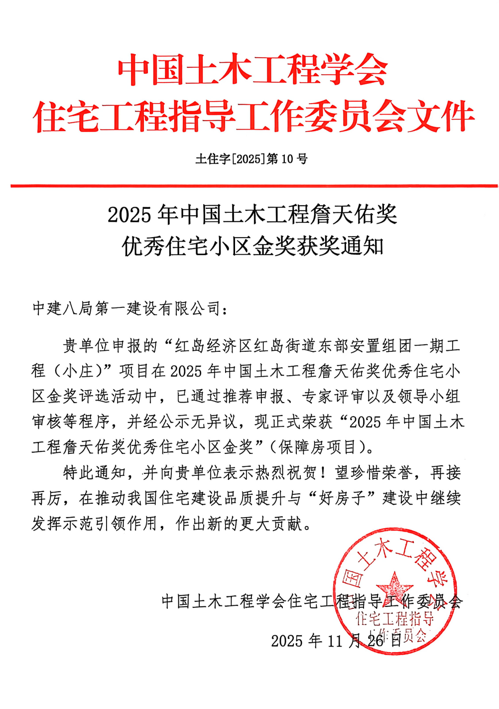 近日,2025 年中國土木工程詹天佑獎優(yōu)秀住宅小區(qū)金獎名單公布,中建八一承建的紅島安置房東部組團(tuán)項(xiàng)目小莊地塊入選,目前公司已累計(jì)獲得 14 項(xiàng)詹天佑獎優(yōu)秀住宅小區(qū)金獎,彰顯 “八一建造” 的匠心品質(zhì)。