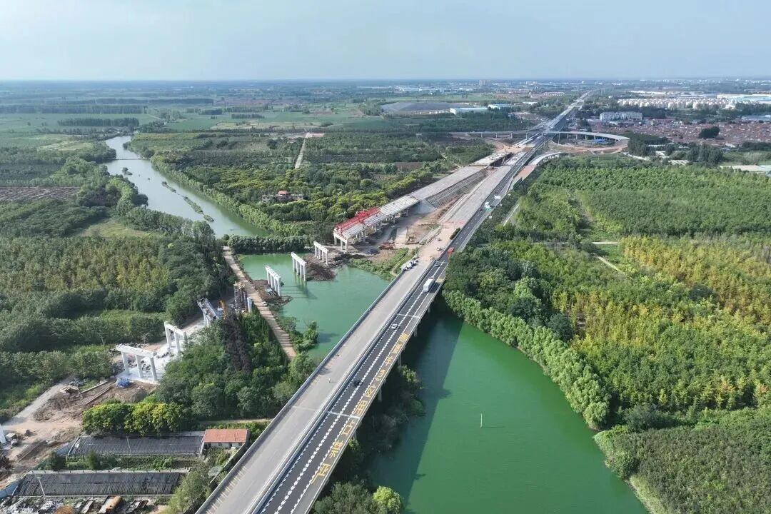 項目途經(jīng)全線唯一特大橋 —— 跨膠濟鐵路特大橋,由于原橋梁部分橫跨植被和河流,原定的雙側(cè)拼寬施工方案空間受限,施工難度大且工程進展緩慢,項目因地制宜采用 “單側(cè)分離新建” 方案,從兩側(cè)各加兩車道變?yōu)橐粋?cè)新增四車道,在大橋北端進行 “路基改橋” 作業(yè)。
