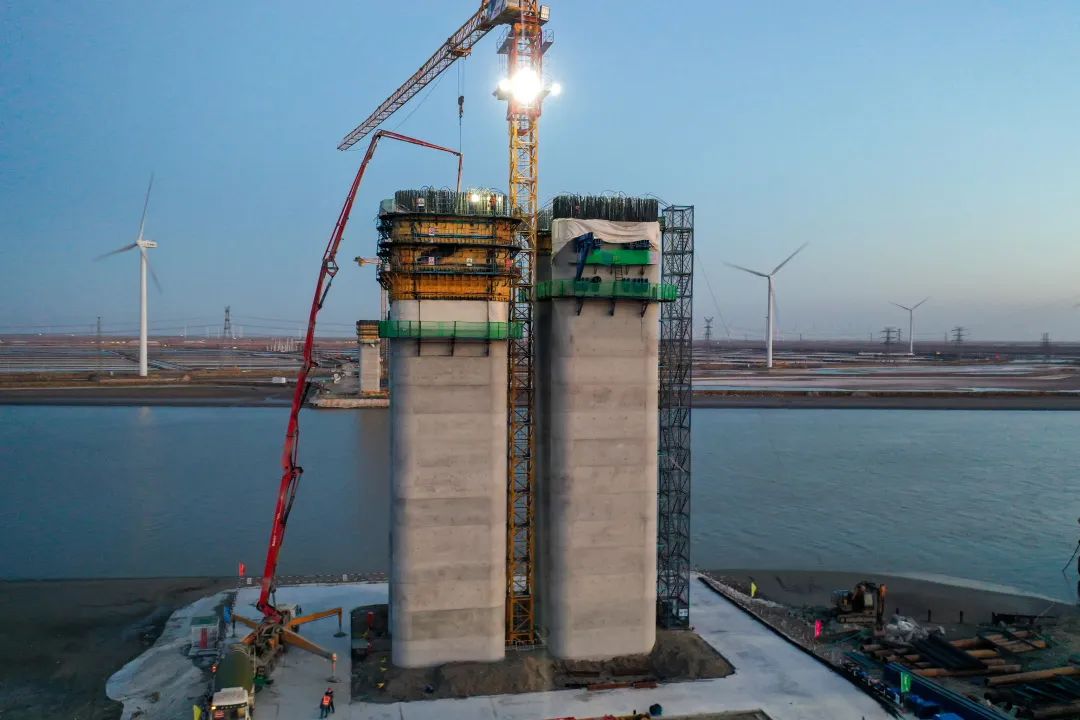 3月1日晚,G228丹東線濱州段項(xiàng)目連續(xù)奮戰(zhàn)8個(gè)小時(shí),完成套爾河特大橋首墩最后一節(jié)澆筑,標(biāo)志著世界第一跨徑梁橋,正式邁入橋梁上部結(jié)構(gòu)施工階段,墩柱高達(dá)42. 5米,相當(dāng)于兩個(gè)標(biāo)準(zhǔn)籃球場(chǎng)的大小,基坑開(kāi)挖深度超13米,項(xiàng)目團(tuán)隊(duì)?wèi)?yīng)用超緩凝混凝土分兩層進(jìn)行澆筑,首次澆筑高度3.