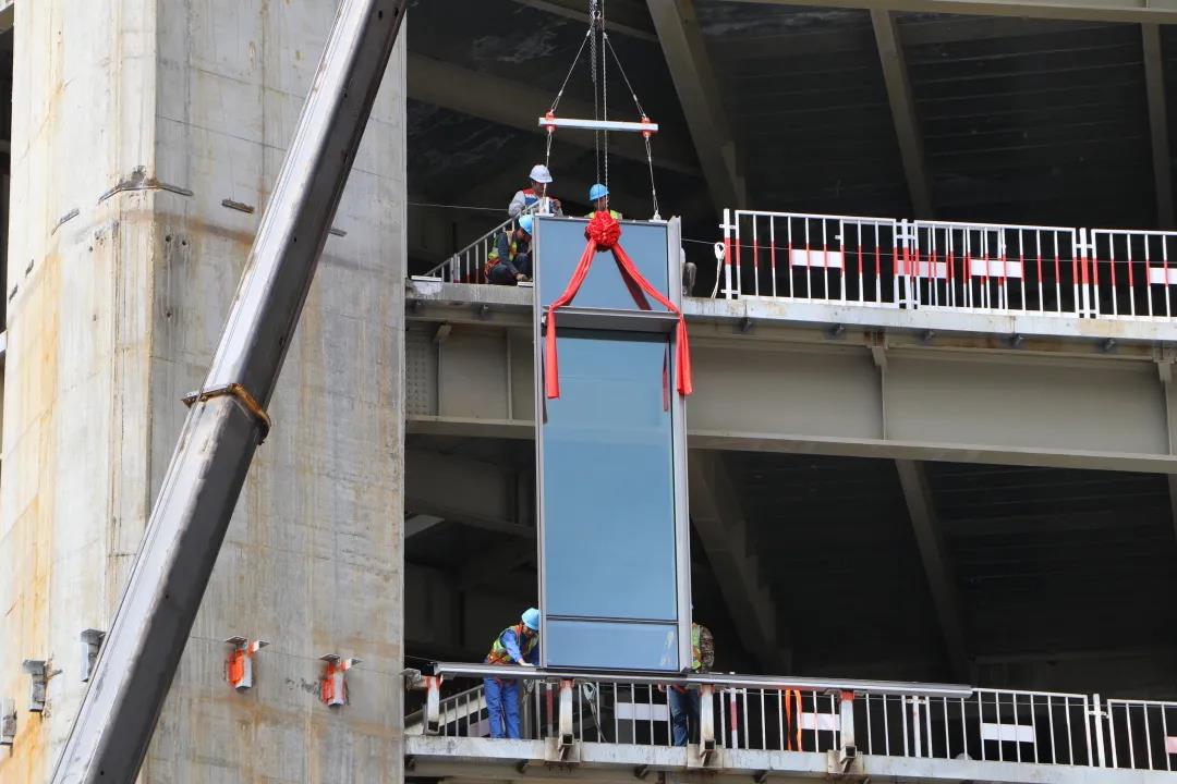 9月29日,隨著“吊裝啟動”令下,中國國際絲路中心大廈首塊幕墻單元板緩緩升空,順利完成吊裝。