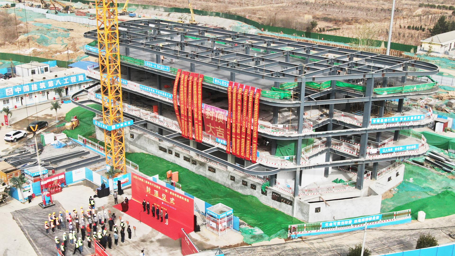 近日,濟南先行區(qū)的首家三甲醫(yī)院——山東大學第二醫(yī)院北院區(qū)(一期)感染性疾病科項目,奮戰(zhàn)63天,提前9天完成主體結(jié)構(gòu)封頂這一重要節(jié)點目標。