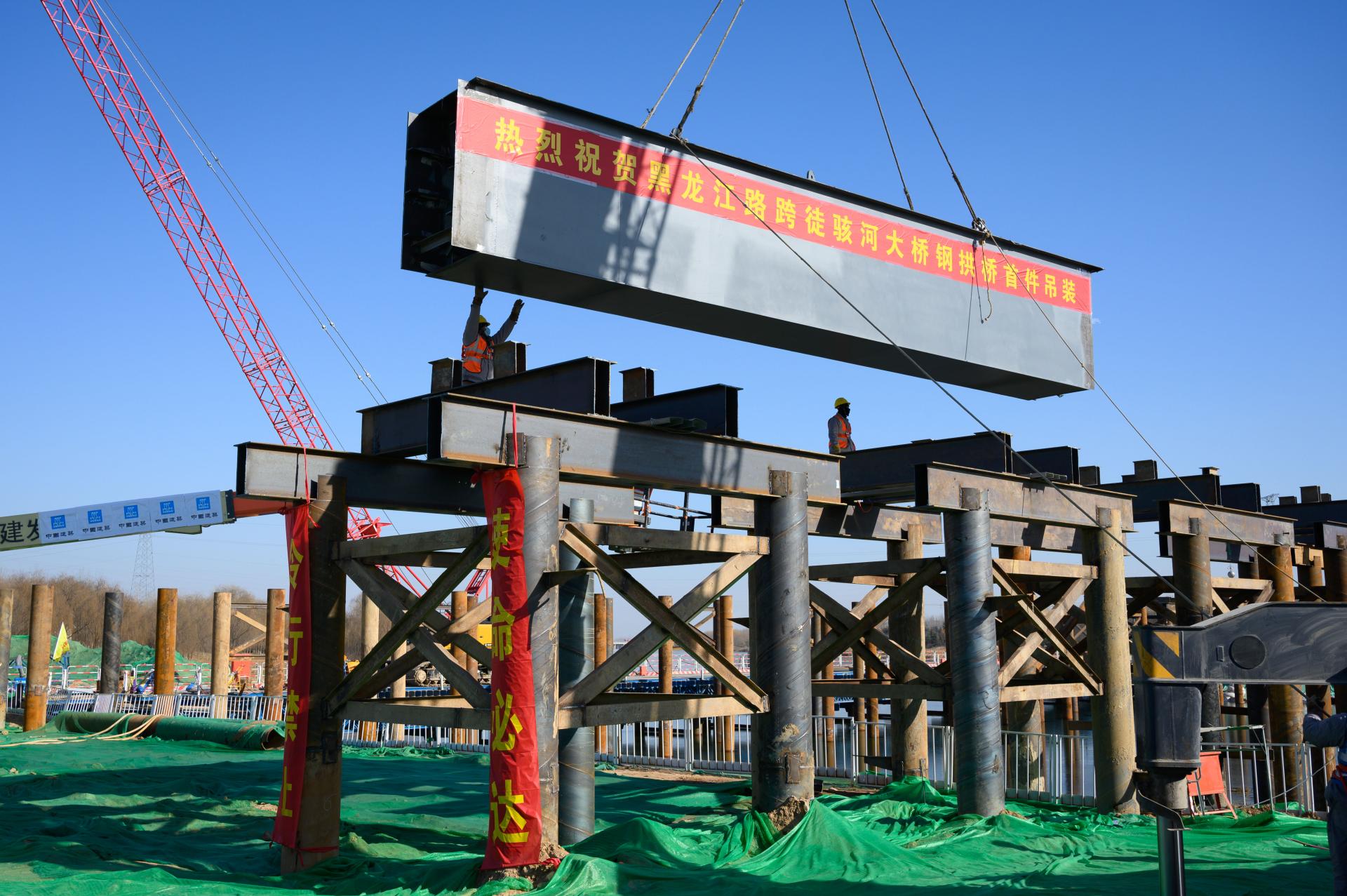 1月7日,在山東聊城,山東省內(nèi)采用UHPC混凝土的最大鋼結(jié)構(gòu)中承式桁架拱橋——聊城市黑龍江路跨徒駭河大橋,在-19℃嚴(yán)寒中進(jìn)行了第一次鋼結(jié)構(gòu)主縱梁桿件吊裝,標(biāo)志著大橋正式從下部結(jié)構(gòu)施工進(jìn)行到上部鋼結(jié)構(gòu)施工。