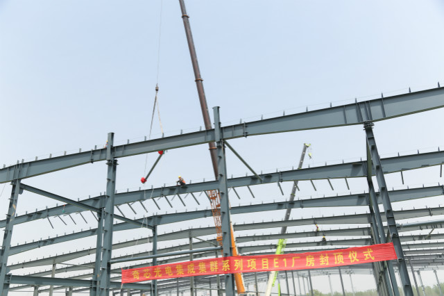 4月18日,奇芯光電項(xiàng)目E1廠房舉行了鋼結(jié)構(gòu)封頂儀式。