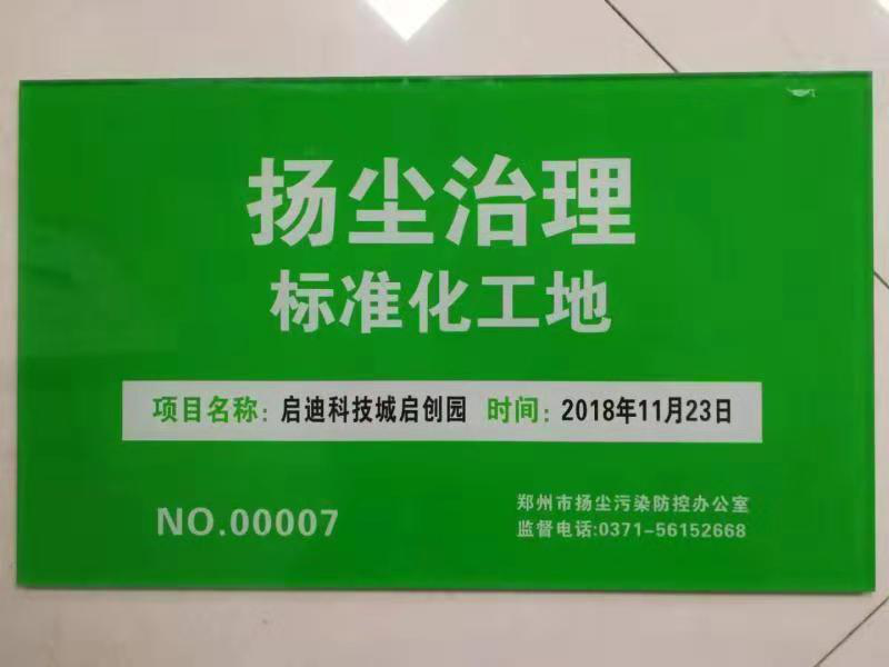 2018年11月27日,鄭州市舉行首批揚(yáng)塵治理標(biāo)準(zhǔn)化工地授牌儀式,鄭州啟迪科技城啟創(chuàng)園項目被授予鄭州市首批“揚(yáng)塵治理標(biāo)準(zhǔn)化工地”掛牌(俗稱“綠牌”)。