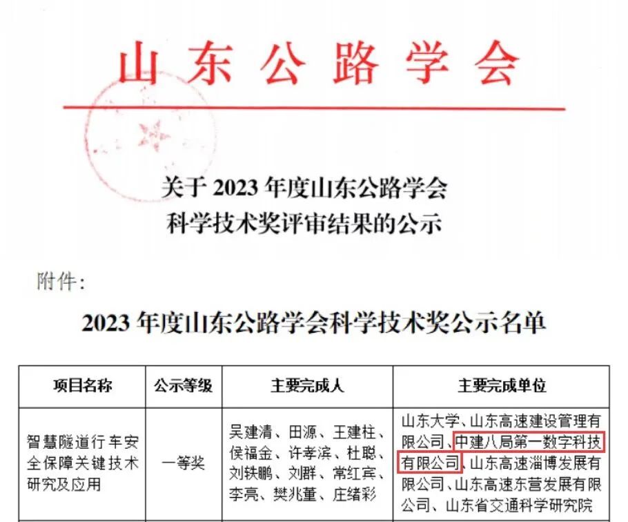 近日,2023年度山東公路學(xué)會科學(xué)技術(shù)獎完成評審結(jié)果公示,中建八局第一數(shù)字科技有限公司參與的”智慧隧道行車安全保障關(guān)鍵技術(shù)研究與應(yīng)用”科技創(chuàng)新項目獲評山東公路學(xué)會科學(xué)技術(shù)獎一等獎。