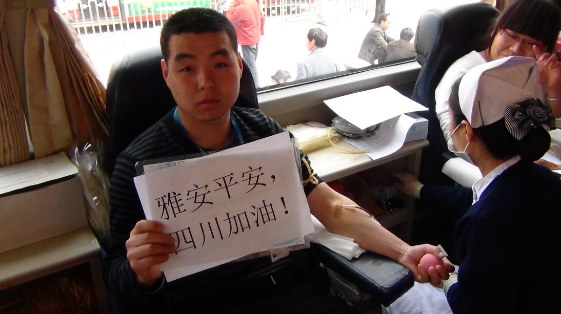 四川雅安地震發(fā)生后,當(dāng)?shù)氐氖転?zāi)情況一直牽動著一公司廣大職工的心。4月21日早上,在得知雅安血庫告急,需要支援的消息后,一公司北京華電項(xiàng)目黨支部自發(fā)組織“四川加油,雅安平安,志愿獻(xiàn)血,支援雅安”的獻(xiàn)血活動,項(xiàng)目職工薛燕軍、許瑩瑩、李作棟、王金貴、孔慶俊在項(xiàng)目黨支部書記西濤的帶領(lǐng)下來到北京西站無償獻(xiàn)血點(diǎn)獻(xiàn)血,用實(shí)際行動支援雅安。(西濤)