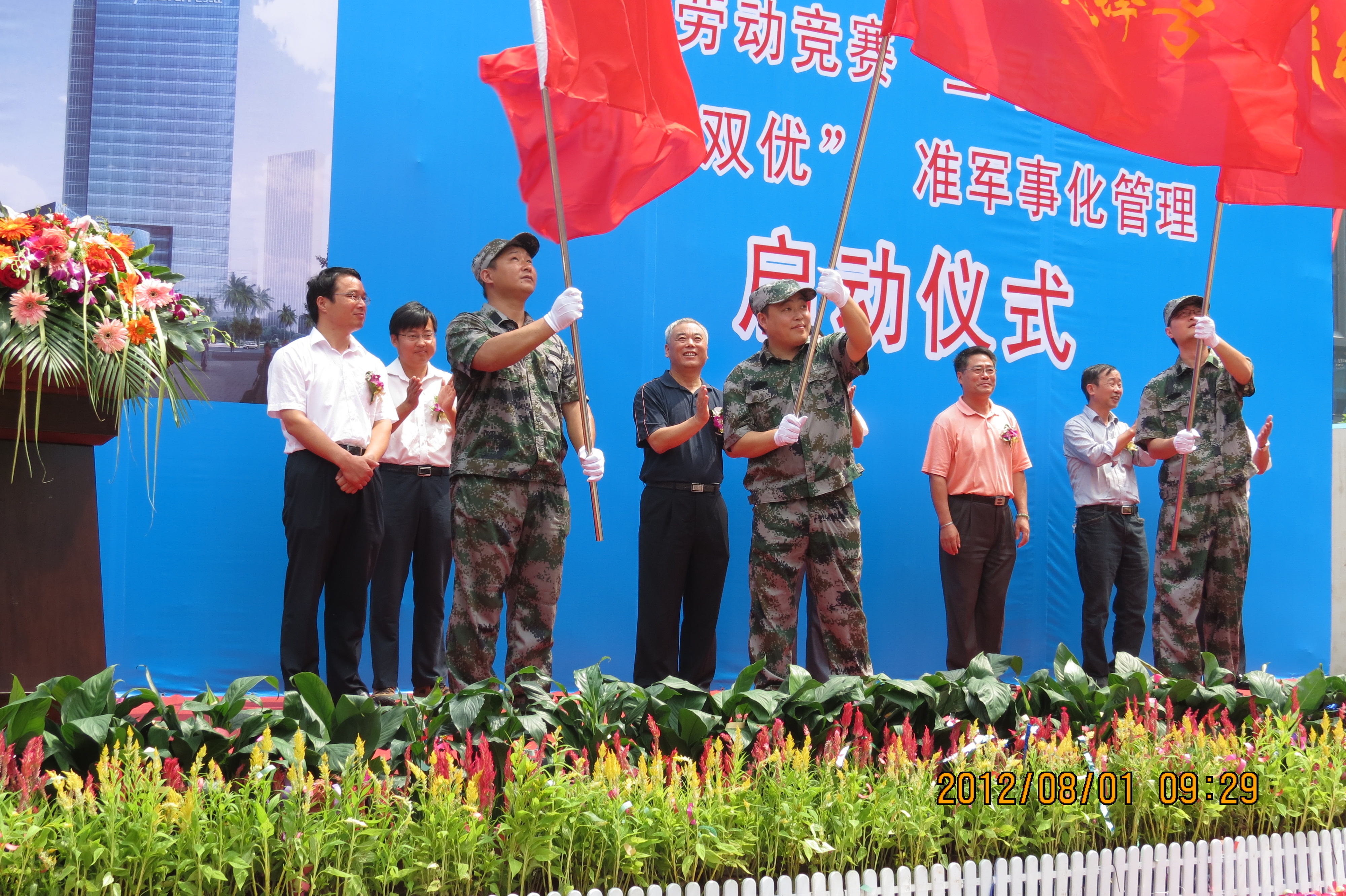 “發(fā)揚(yáng)鐵軍精神,頑強(qiáng)拼搏,奮勇爭先,精細(xì)管理,精心施工,打造精品工程?!毙x誓詞的聲音鏗鏘有力,員工的干勁激情似火。8月1日“建軍節(jié)”這天,創(chuàng)維半導(dǎo)體設(shè)計大廈項目隆重舉行勞動競賽、“三號聯(lián)創(chuàng)”、創(chuàng)“雙優(yōu)”暨準(zhǔn)軍事化管理活動啟動儀式。創(chuàng)維半導(dǎo)體設(shè)計大廈項目總經(jīng)理林力,深圳市建控地盤監(jiān)理有限公司副總經(jīng)理王玉祥、項目總監(jiān)楊躍明,總公司駐廣東辦事處黨工委副書記閔國安,局駐廣州辦事處副主任楊深奎及公司工會主席等領(lǐng)導(dǎo)及項目部全體員工、各分包隊伍共120余人參加了活動。