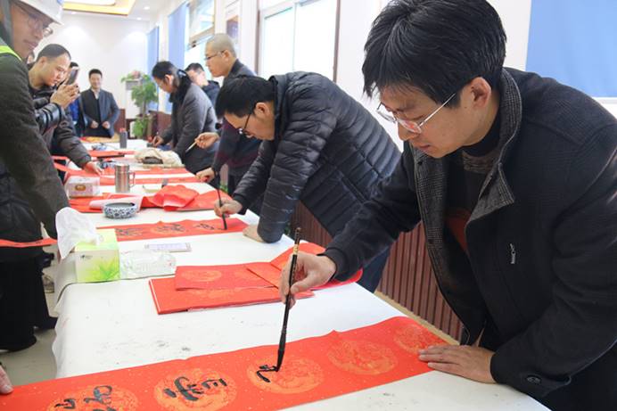 1月14日,公司濟(jì)南中央商務(wù)區(qū)安置區(qū)(CBD)項目熱鬧非凡。山東省青年書協(xié)常務(wù)副主席李成軍,省青年書協(xié)副主席兼秘書長黨現(xiàn)強(qiáng),省青年書協(xié)副秘書長、山東財經(jīng)大學(xué)副教授王子庸,省青年書協(xié)理事、市青年書協(xié)副主席王奇嵩四位書法家及公司書法協(xié)會成員徐偉、吳天均、張廣超,現(xiàn)場揮毫,一刻不得閑,一條條寫有新春祝福的對聯(lián),散發(fā)著清新墨香,一張張桌子前人頭攢動。